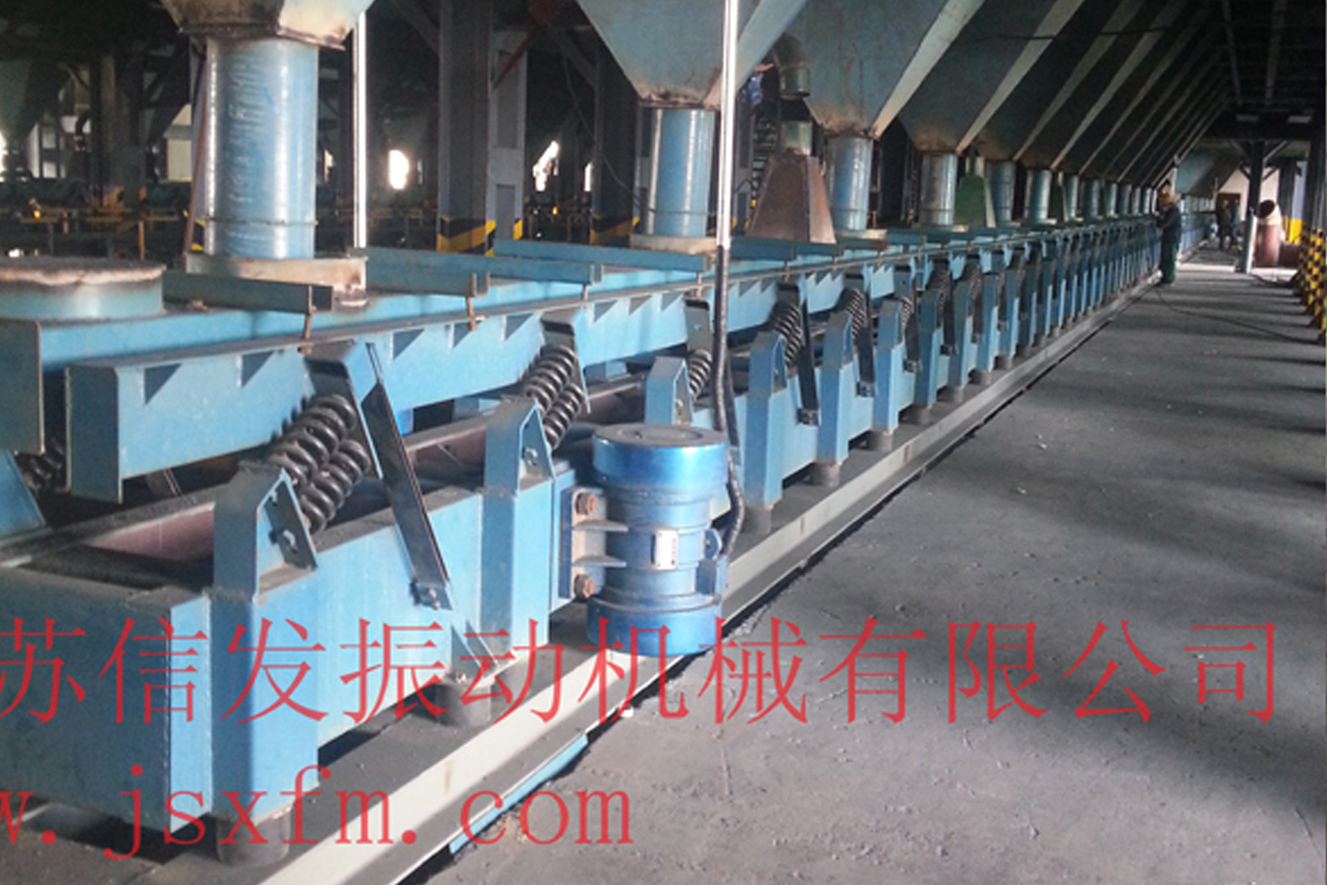 慣性振動(dòng)熱料輸送機(jī)是一種兼有鎖風(fēng)功能的長距離振動(dòng)輸送機(jī)設(shè)備,采用兩臺(tái)振動(dòng)電機(jī)作為激振動(dòng)源,運(yùn)用自同步原理,兩臺(tái)振動(dòng)電機(jī)反向轉(zhuǎn)動(dòng),使輸送機(jī)底部平衡架產(chǎn)生往復(fù)振動(dòng),經(jīng)過主振簧與導(dǎo)向板簧的作用,帶動(dòng)上部輸送槽振動(dòng),從而達(dá)到輸送物料的目的。